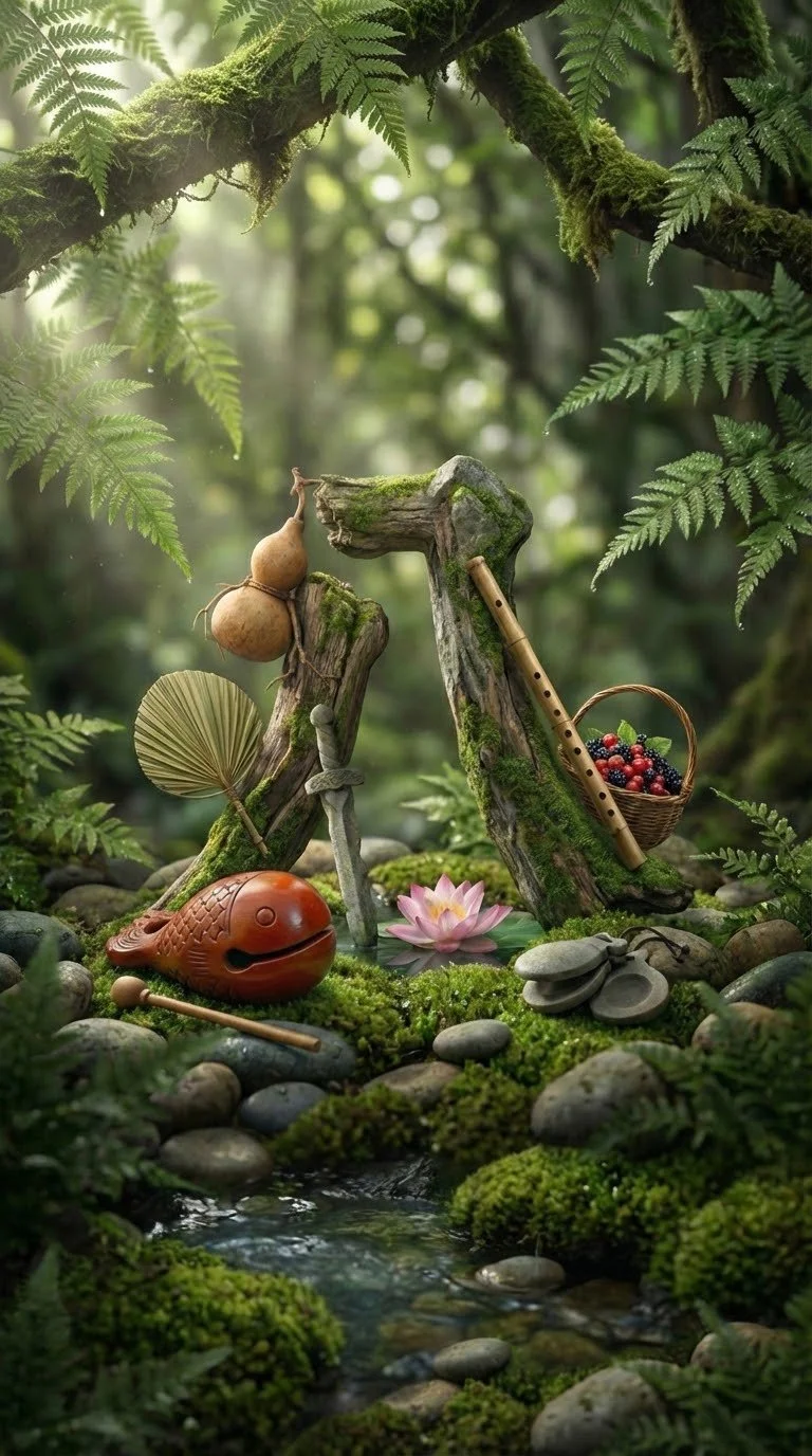 With the Eight Immortals as sworn kin, I offer ginseng and savor the refreshing peaches.