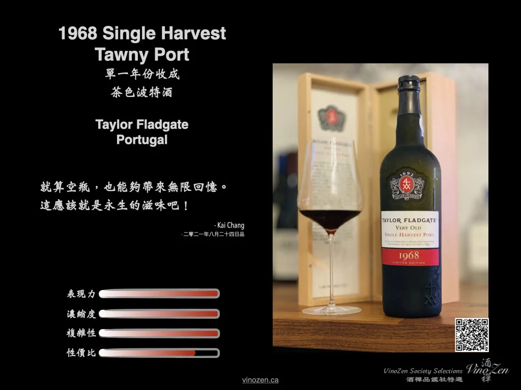這個是Taylor Fladgate酒莊從1964年開始每年的限量款。 以五十年前單一年份釀造的波特酒入桶達到完整熟成的巔峰。